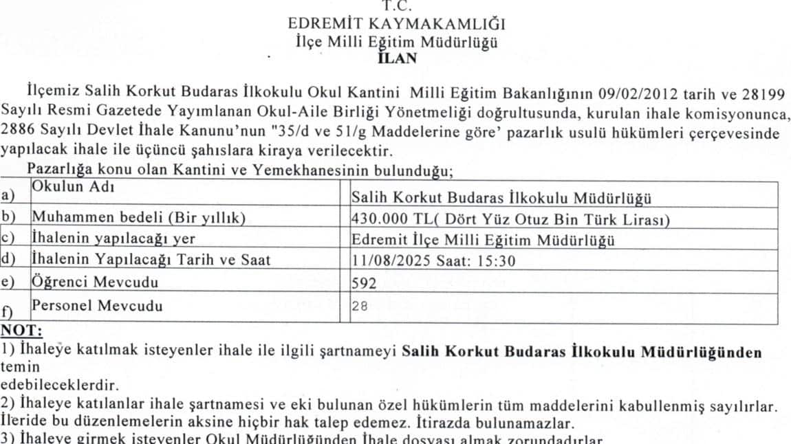 İlçemiz Salih Korkut Budaras İlkokulu Okul Kantini Milli Eğitim Bakanlığının 09/02/2012 tarih ve 28199 Sayılı Resmi Gazetede Yayımlanan Okul-Aile Birliği Yönetmeliği doğrultusunda, kurulan ihale komisyonunca, 2886 Sayılı Devlet İhale Kanunu’nun "35/d ve 51/g Maddelerine göre’ pazarlık usulü hükümleri çerçevesinde yapılacak ihale ile üçüncü şahıslara kiraya verilecektir.